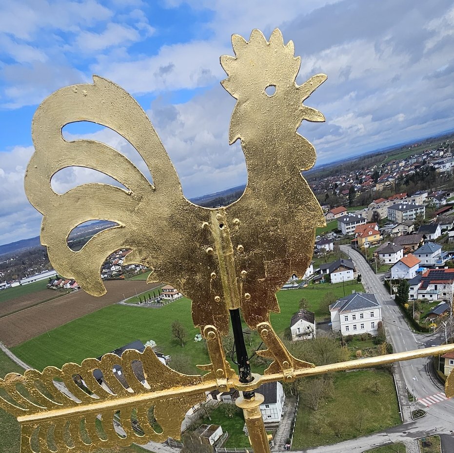 Die Sanierung des Kirchturmes im Okt. 2024 - und jetzt im März 2025 die Neuschaffung des Kreuzes inklusiv goldener Kugel ist gut über die Bühne gegangen.