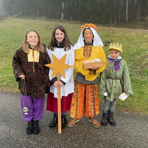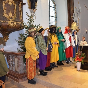 Am Dreikönigstag gestalteten die Sternsinger den Wortgottesdienst, den Diakon Anton Kimla mit uns feierte. Mit dem Lied "A Liacht in der dunklen Zeit" - begleitet von fünf Blasmusikern - zogen drei der sechs Sternsingergruppen mit Stern und Weihrauch in die Kirche ein.
