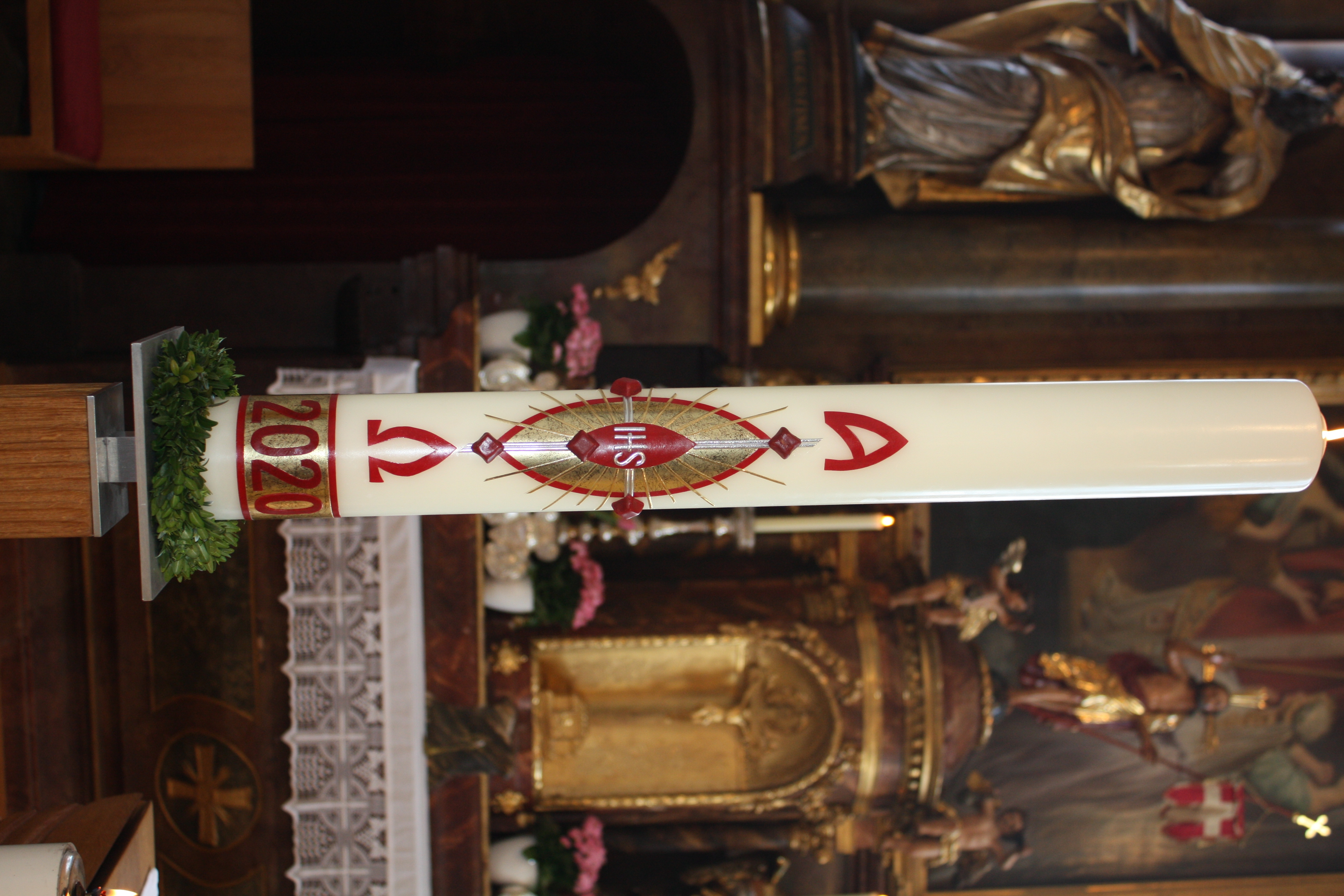 Osterkerze 2020 Einen herzlichen Dank an Spindler Gusti für die schöne Gestaltung und dem Spender der Osterkerze.