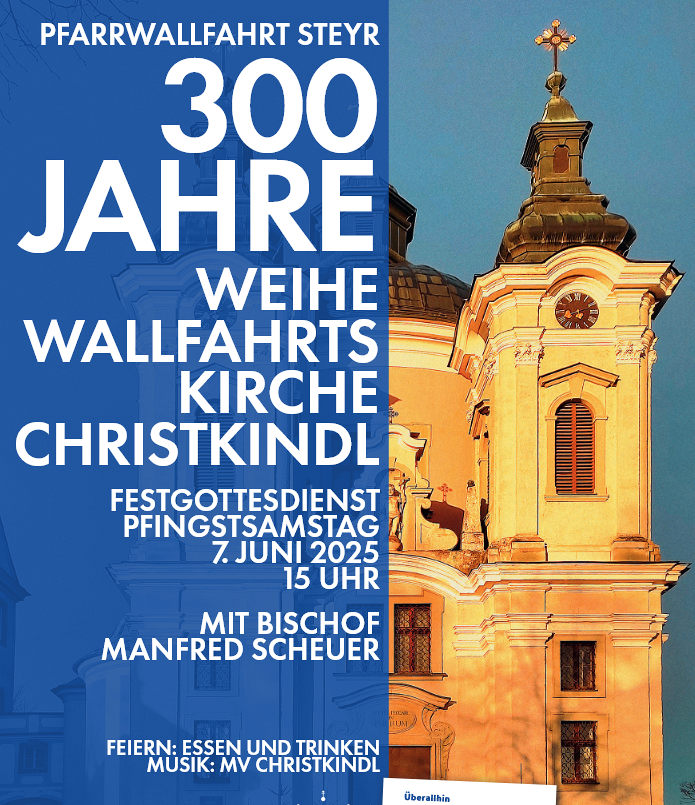 Aus Anlass des Jubiläums „300 Jahre Einweihung der Wallfahrtskirche Christkindl“ sind am Pfingstsamstag, 7. Juni 2025 alle Pfarrgemeinden der Pfarre Steyr unter dem Motto „Überallhin gehst du mit uns“ zu einer Wallfahrt nach Christkindl eingeladen. Das Christkindl-Gebet begleitet alle Pilgergruppen. Dazu gibt es verschiedene Möglichkeiten: